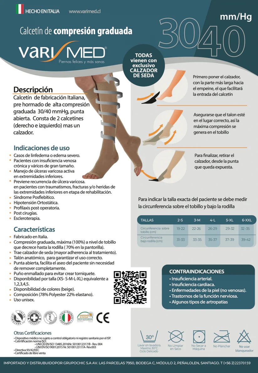 Calcetín de fabricación Italiana, pre hormado de alta compresión graduada 30-40 mmHg en una sola capa con punta abierta. Consta de 2 calcetines (derecho e izquierdo) más un calzador.